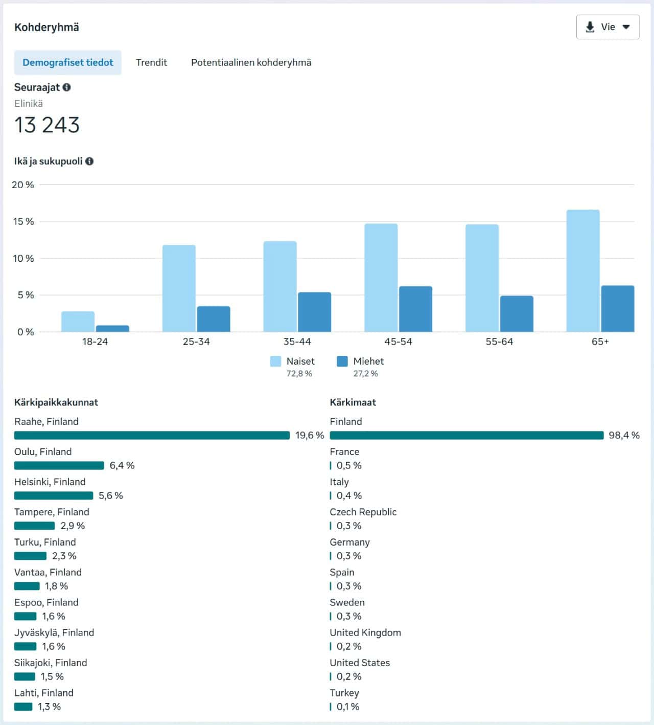 Jotta orgaaninen näkyvyys muuttuisi myynniksi, yleisö täytyy tunnistaa ja ymmärtää. Raahe Guiden Facebook-seuraajien demografia paljastaa, että suurin osa yleisöstä on naisia (72,8 %) ja että ikäjakauma painottuu 35–65+ -vuotiaisiin. Nuoria, alle 25-vuotiaita seuraajia on vain muutama prosentti. Tämä ei ole sattumaa. Sisältö, jota jaamme – paikalliset palvelut, tarjoukset, tapahtumat – kiinnostavat todennäköisemmin aikuista väestöä, joka tekee perheen ostospäätöksiä.