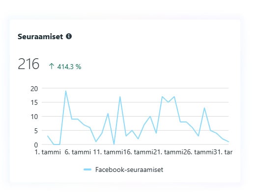 - Uudet seuraajat: +216. Tämä luku näyttää, kuinka monta uutta seuraajaa sivu sai kyseisen kuukauden aikana. Se on noin 1,7 % kokonaisseurajamäärästä. Vaikka emme tavoittele seuraajien määrän kasvattamista, se osoittaa, että orgaaninen sisältö voi silti tuoda uusia seuraajia, kun se tarjoaa arvoa.