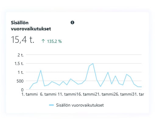 - Sisällön vuorovaikutukset: 15 400. Tämä luku kattaa reaktiot, kommentit ja jaot. Ne ovat tärkeitä signaaleja, mutta eivät olleet päätavoitteemme. Se, että vuorovaikutuksia syntyi, kertoo kuitenkin, että sisältö resonoi ja herätti tunteita.