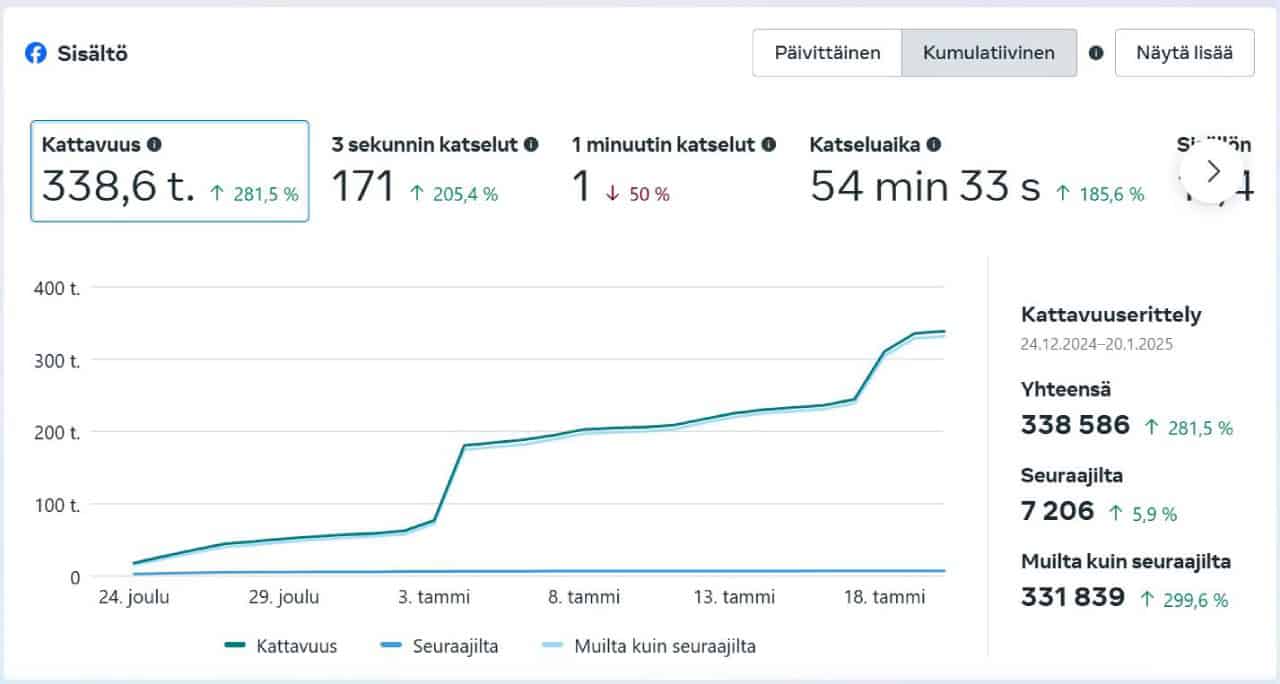 - Ei-seuraajien osuus: 78 %. Tämä tarkoittaa, että suurin osa niistä, jotka näkivät sisältömme, ei seurannut sivua. He tulivat algoritmin “suosituksista” tai jakojen kautta. Tämä on keskeinen onnistumisen mittari; se kertoo, että sisältö rikastuttaa Facebookin feediä niin, että se jaetaan laajalle yleisölle.